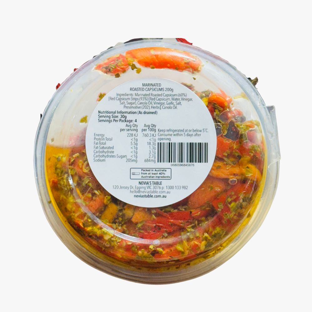 Nevia’s Table Marinated Capsicum Strips are a 200g specialty deli product featuring flame-roasted red peppers sliced into uniform, easy-to-serve strips. These capsicums are marinated in a seasoned oil blend infused with garlic and a selection of traditional Mediterranean herbs. The product is crafted to maintain a soft yet structural integrity, providing a clean-label vegetable accompaniment that is naturally Vegan and Gluten-Free, focusing on the quality of the roast and the purity of the marinade.